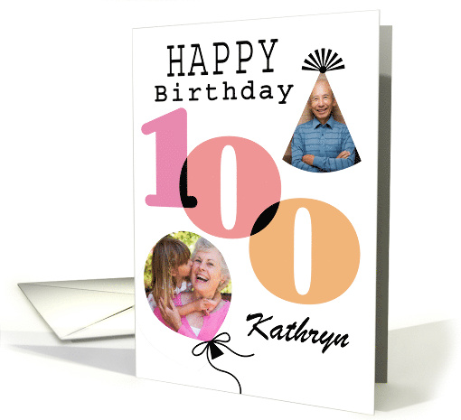 Enjoy a rare opportunity to celebrate Kathryn's 100th birthday with a unique card that includes a couple of personalized photos, the number one hundred and her name in a tasteful pink and peach color scheme.