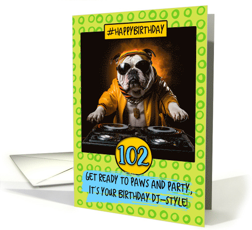 An english bulldog as a DJ bringing the house down with his sick birthday tunes with the hashtag #happybirthday in a yellow box on a lime-green background with a circle pattern and the text "102 get ready to paws and party, it's your birthday dj-style!". A fun card to send to your favorite 102-year old for their birthday.