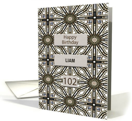 102nd birthday card to personalize. Add a name to wish someone special a happy birthday. This card has a very masculine feel and is composed of interlocking geometric figures. The main color is brown, with black and white. A lovely card that any man will love.