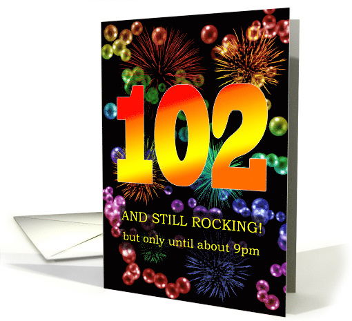 Celebrate a 102nd birthday with a funny card. Still rocking, but only until 9pm has a ring of truth that will give a laugh. A great birthday card for the ageing rocker in your life.