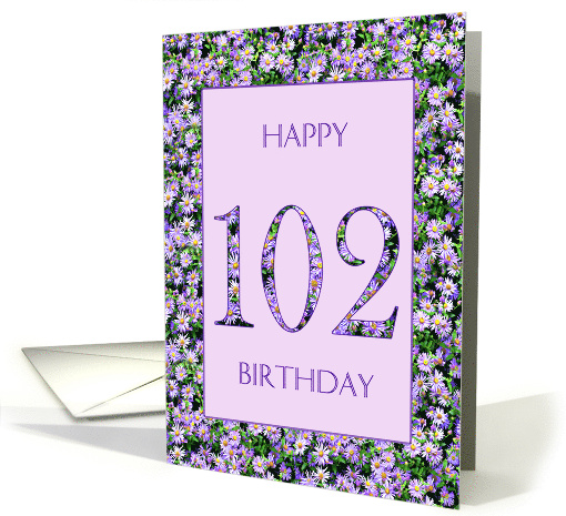 102nd Birthday card for a lady who likes flowers. An elegant birthday card with a background of purple daisy flowers. This is the perfect card for a girl who loves anything floral or purple!
