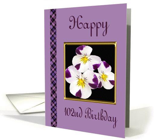 Celebrate a special 102nd Birthday with this card that features a lavender background, laverender plaid stripe and colorful Johnny Jump-Ups. Card Design ©2013 Kreative Sentiments Cards by Sherry Harris