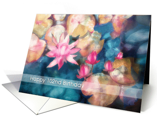 This "Happy 102nd Birthday" card features my original watercolor painting of pink water lillies floating on a blue lake. You can edit/add text inside card. Custom requests welcome.