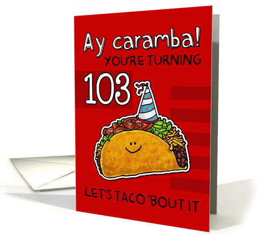 Cute cartoon of a kawaii taco with party hat on a red background with the text "Ay Caramba! You're turning 103, let's taco 'bout it." Fun birthday card for everyone!