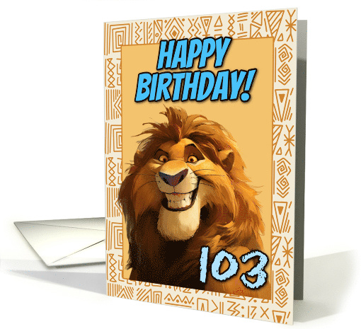 This birthday card features a cartoon-style lion with a big, toothy grin. The lion has a fluffy mane and an expressive face that conveys excitement and happiness. The background of the card is a warm yellow color, and it's framed by a border of various geometric patterns and shapes in a light brown or orange color. These patterns give the card an African or tribal-inspired aesthetic, which complements the lion theme. The text "HAPPY BIRTHDAY!" is prominently displayed at the top in large, blue letters with a black outline, giving it a bold, energetic look.