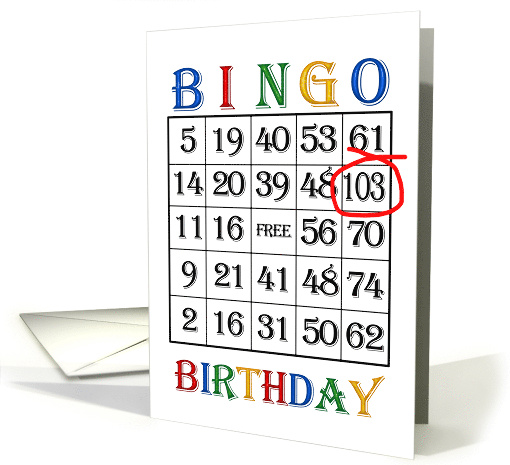 103rd Birthday card. Say Happy Birthday to a bingo player with a bingo card. The age is circled in red. A bingo crazy player will get a huge kick out of this card! Copyright Norma Cornes.