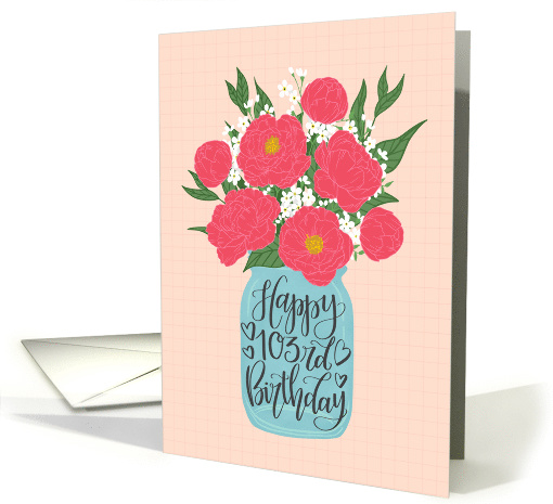 A mason jar filled with a gorgeous bunch of peonies with the hand lettered words 'Happy 103rd Birthday' by Ness Nordberg. The perfect birthday card for someone who is turning 103.