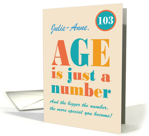 A cheerful birthday card to customize for someone who is turning one hundred and three, with, 'AGE is just a number' in large brightly coloured retro lettering. Up above, in the right hand top corner, is a circle with the number, 103, and below, in blue-green handwriting script is, 'And the bigger the number, the more special you become!' There is a large space at the top for you to add the name or relationship (eg 'Uncle') of the recipient. The inside message is just a suggestion and you can easily change it or delete it altogether if you prefer a 'Blank Inside' card.