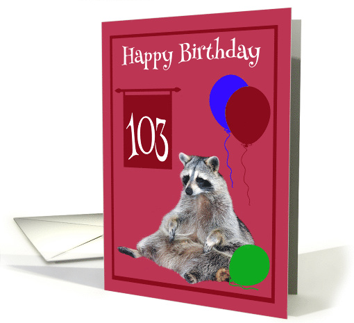 Wish anyone, in general, Happy 103rd Birthday with an adorable raccoon, Rocky sitting next to a kisses and hugs tapestry surrounded by colorful balloons of blue, green, red on a light magenta background with white text. Inside like all cards on Greeting Card Universe can be personalized by you if you wish. FYI; Christopher Columbus, was the first person to leave a written record about raccoons. Head to hindquarters, raccoons measure between 16 and 28 in, not including the bushy tail which can measure between 8 and 16 in. However, in captivity they can get a lot bigger especially if they are not on a proper diet.