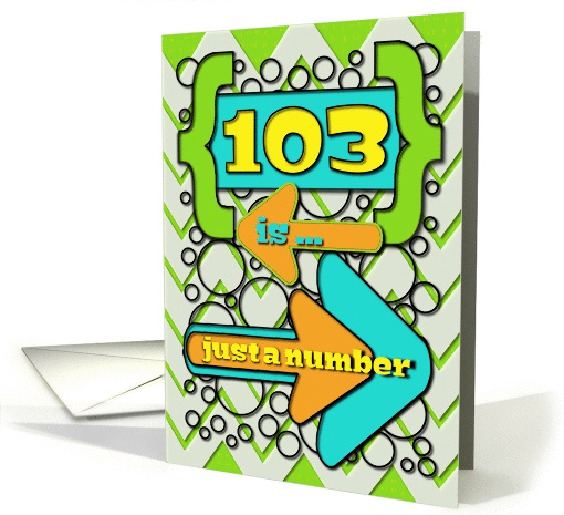 Say Happy 103rd Birthday with this design of bright colored arrows,chevrons,polka dots and a funny sentiment.Original digital art design by Betsy Bush of Birthday Cards Cafe'.
