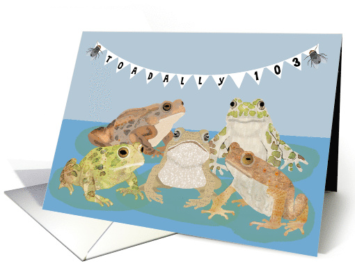 | Artist Notes: | This Funny 103rd birthday card features a grouping of sweet toads on lily pads. Wish them a toadally fun 103rd birthday. |