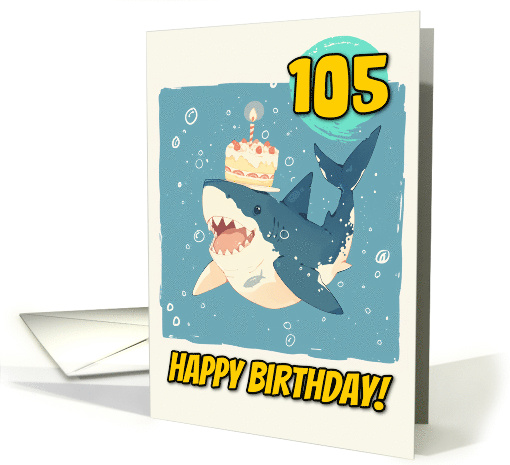 A playful and whimsical underwater scene featuring a cartoon shark with a birthday cake balanced on its head. The shark is swimming with its mouth wide open, revealing rows of sharp teeth. The cake is a small, two-layer dessert with white frosting, strawberries on top, and a single lit candle. The background is a light blue color, representing the ocean, with various sized bubbles floating around the shark. Suitable for children and teens, ocean and marine life enthusiasts, individuals with a quirky or offbeat sense of humor, fans of cute-but-dangerous aesthetic, summer birthday celebrants, and anyone looking for a non-traditional birthday card.