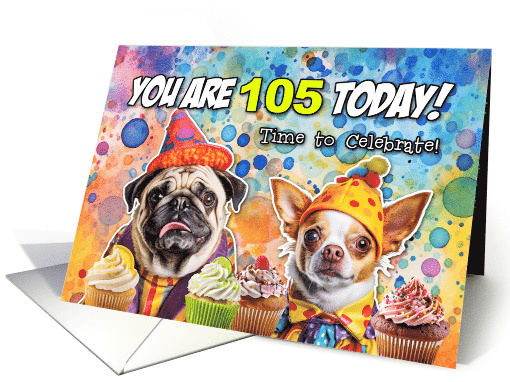 | Artist Notes: | A festive pug and chihuahua in colorful outfits on a confetti type splatter watercolor background and yummy cupcakes with the text! "you are 105 today! Time to Celebrate!" A fun card to send to your favorite 105-year old. |