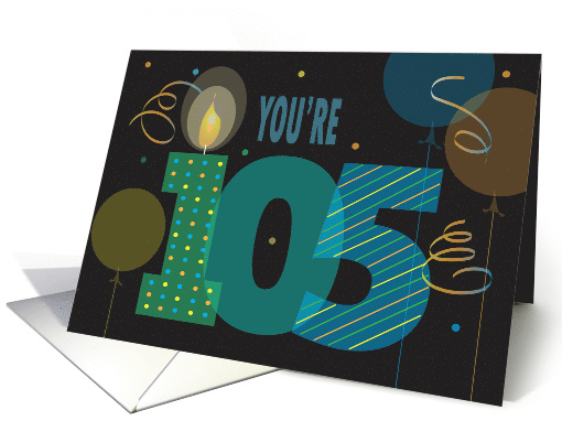 This card honors a birthday we all hope to someday celebrate! What a festive celebration it will be for your friend, family member or neighbor, who is now turning 105 years old. Giving them this vividly colored card, with the large "1"-"0"-"5" in green, teal and turquoise numbers, below the wording "You're 105", written in turquoise, will brighten this important birthday. The card's black background makes the colors more brilliant, and where the large decorated numbers overlap, unique new shades of these vivid colors are created. The party begins, with a candle flame topping the first number, "1", making it look just like a birthday candle. Streamers for the party curl through the air around the age on the card and balloons decorate the card's background. The inside wording of the card says "The older you get, the brighter you shine! Happy 105th Birthday!"