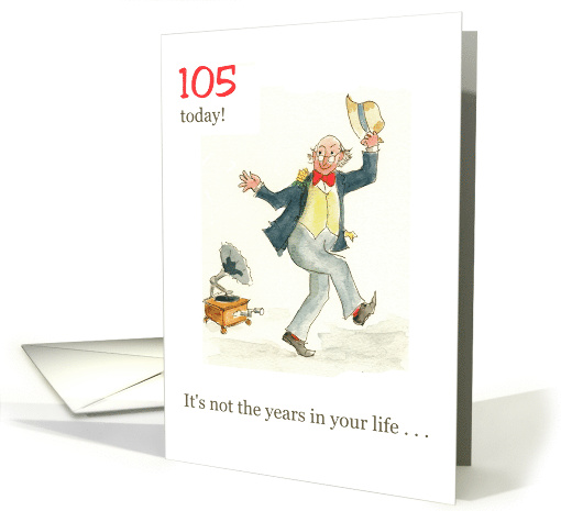 | Artist Notes: | A light-hearted age-specific 105th Birthday Card with an older man dancing and the Abraham Lincoln quotation, 'It's not the years in your life but the life in your years that counts', from a watercolour illustration by Judy Adamson |