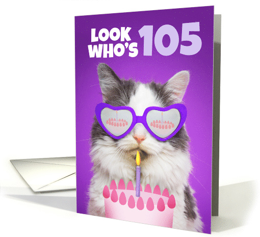 | Artist Notes: | With bold letters shouting "LOOK WHO'S 105" and a vibrant purple background, this adorable white cat wearing heart shaped sunglasses is a purr-fect way to say Happy Birthday! |
