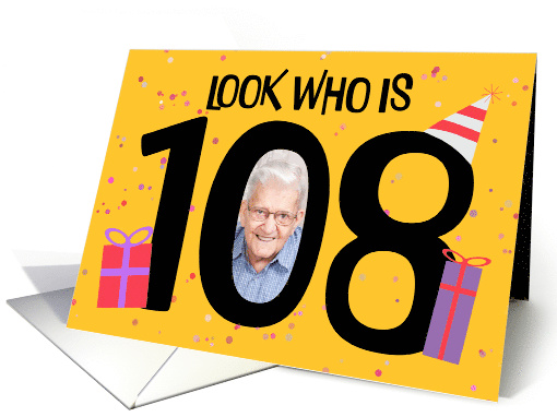 | Artist Notes: | Whoa! Turning 108 is a huge deal so put a picture of the birthday person in the 0 of 108 on this yellow design with confetti and presents to wish them a Happy 108th Birthday! |
