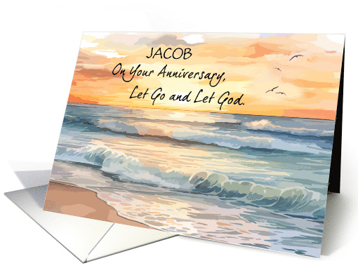 | Artist Notes: | This beautiful anniversary card features a peaceful watercolor beach scene at sunset, with soft waves lapping at the shore and birds flying across a warm, colorful sky. The serene imagery reflects the journey of faith and growth, making it a perfect way to celebrate an important milestone. With the message "On Your Anniversary—Let Go and Let God", this card offers heartfelt encouragement, reminding the recipient of their strength and the faith that has guided them. A customizable name on the front makes it a personal and meaningful way to commemorate their journey. |