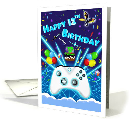 Gear up for an unforgettable 12th birthday with this action-packed gamer card! A bold game controller takes center stage amid a whirlwind of dragons, airplanes, balloons, confetti, and a “Level Up” chocolate cake. Bursting with quirky, fun-filled details, this card brings the thrill of a colorful gaming world right into the birthday celebration—perfect for adventurous kids who live and breathe video games.