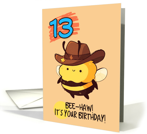 Bee-haw! A cute cartoon bumble bee wearing a cowboy hat on a pale orange background with the number 13 in blue and the text "Bee-haw! it's your birthday!" A fun birthday card with a country twist to send to that wonderful 13-year old for their birthday