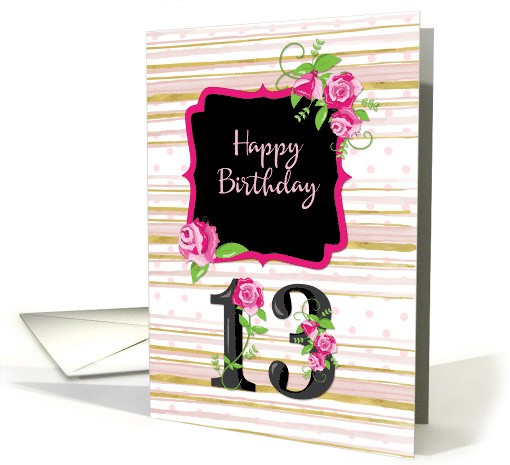 Delight a 13 year old girl on her birthday with this trendy card featuring a pretty black and pink frame with the Happy Birthday message, decorated with pink roses and greenery. The large number 13 is also decorated with roses. The stylish background has pink polka dots and gold and pink stripes.