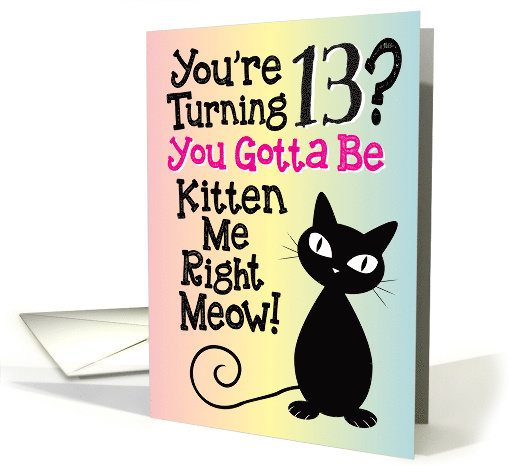 Wish the new teenager a happy birthday with this cute, illustrative cat card featuring the message,You're Turning 13? You Gotta Be Kitten Me Right Meow! Bright, colorful pastel gradient background with pink, yellow, and blue. Inside can be customized with your own message.