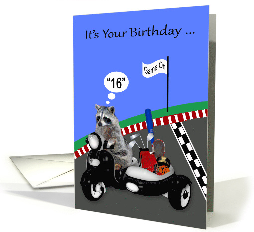 | Artist Notes: | Wish any teenager in general a Happy 16th Birthday with a humorous, card featuring an adorable raccoon, Rocky driving a black scooter with a side car loaded with sports equipment, basketball, tennis racket, tennis ball, golf bag, baseball bat, football helmet speeding past the checkered finish line to get his game on. Fun sport facts: Micheal Phelps has won a total of 28 Olympic medals, the most in Olympics history. Golf is the first and so far, the only sport played on the moon. |