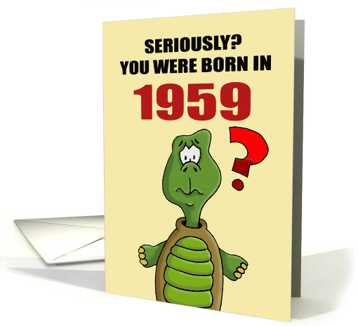 Humorous Birthday card with a puzzled cartoon turtle with a big question mark. The words say, Seriously? You were born in 1959. Inside says, Gosh, that makes you ... ... I mean, Happy Birthday