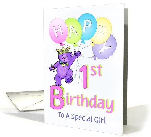 This dancing purple teddy bear princess dressed up in a lovely yellow jeweled crown and pink, blue and green flowers, holding a bunch of balloons, will bring a smile to a special girl on her 1st birthday. Personalize with her name to make it extra special. Original design by Anura Design Studio.