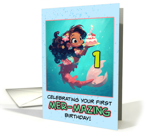Deep in the ocean, a cute latina mermaid is holding a big pink birthday cake with a candle on top just for you. A mer-mazing birthday is ready to kick off! A fin-tastic card for children and young girls, beach dwellers, fantasy and mythology enthusiasts, fans of animation/movies featuring mermaids, sailors or those in maritime professions, ocean conservationists, and your wonderful 1-year old.
