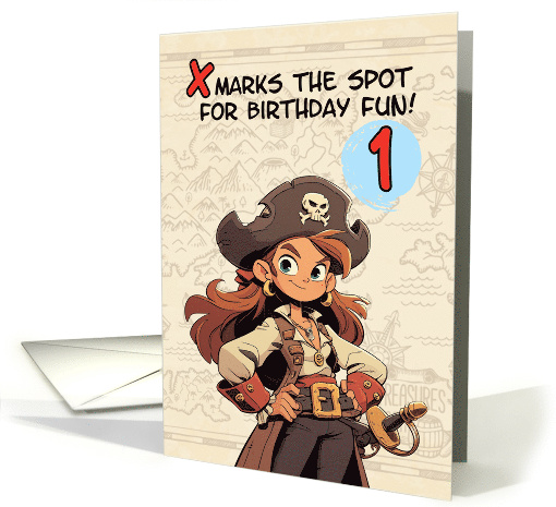 This birthday card features a charming cartoon pirate girl as the main character. She has long, flowing red hair and is wearing a large pirate hat with a skull and crossbones emblem. Her outfit includes a white shirt, dark pants, a red sash, and a belt with a large golden buckle. She's also wearing gold hoop earrings and has a sword at her side. The character has a mischievous, friendly smile. The background resembles an old treasure map with faded illustrations of islands, compasses, and sea creatures. At the top of the card, there's text that reads "X MARKS THE SPOT FOR BIRTHDAY FUN!" with the 'X' in red.