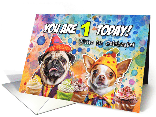 A festive pug and chihuahua in colorful outfits on a confetti type splatter watercolor background and yummy cupcakes with the text! "you are 1 today! Time to Celebrate!" A fun card to send to your favorite 1-year old.