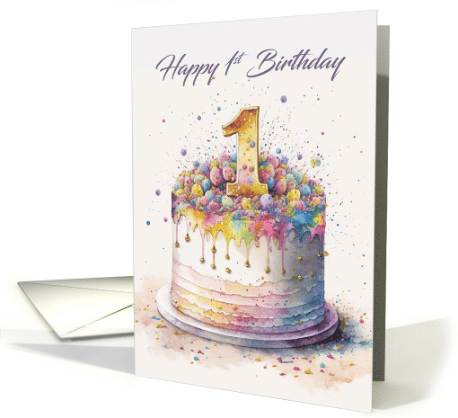 Tasty watercolor first birthday, with exploding colors and candy, a sweet treat Birthday Cake card.