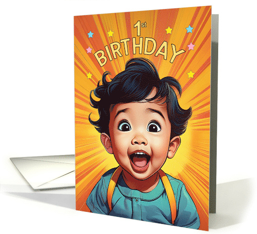 Baby boy's first birthday card with a very happy and adorable boy with black hair and Asian inspired looks created in a comic book theme.