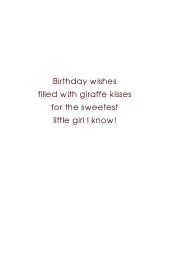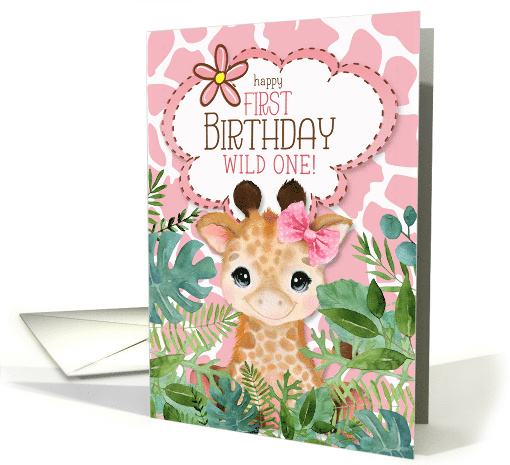 Sweet shades of pale pink on white create an animal print background for this cute little girlie giraffe with a pink bow on this jungle themed First Birthday card.