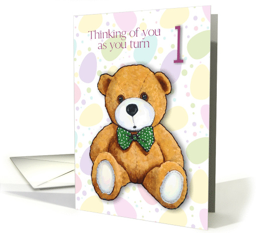 The front of this card features a cute teddy bear wearing a green, polka-dotted bow tie. Words say "Thinking of you as you turn 1". The background is covered in blobs of light color. There is a little verse inside, but, as always, you may customize the inside of the card if you wish.