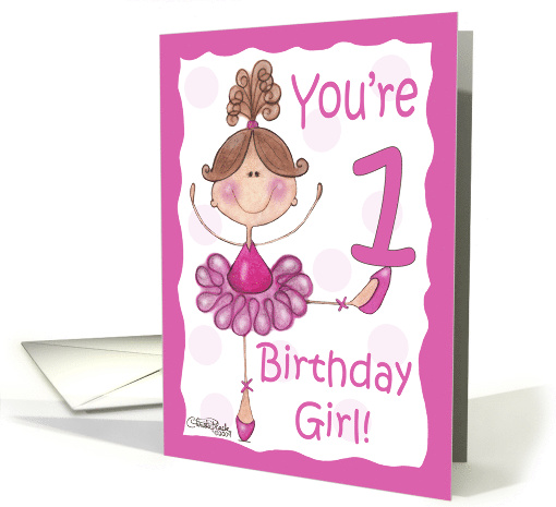 ©Christie Black. A sweet ballerina holds a number one on her out-stretched foot in this birthday card for a little girl celebrating her first birthday. Pink wavy border and light pink polka dotted background.