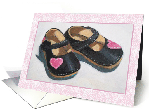 This card features a painting of a tiny pair of little girl's shoes. The shoes have pink hearts stitched on them. A pink lacey border surrounds the image.