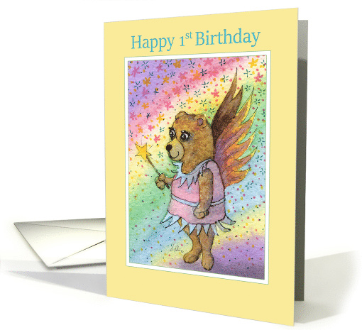 A colourful first birthday card for a girl or a boy, featuring a teddy bear fairy figure holding a star wand.