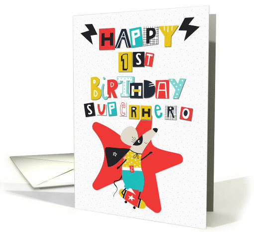 Send an adorable Happy 1st Birthday greeting with this cartoon superhero skateboarding mouse on top of a big red star with fun word art and lightning bolts.
