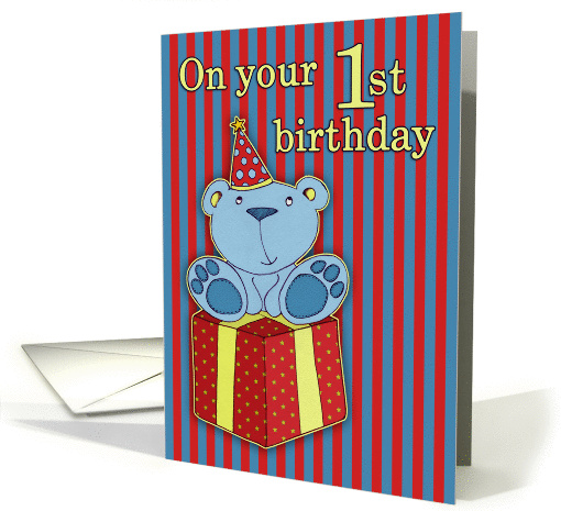 An adorable, cartoon style illustration of a cute baby blue teddy bear, sitting on a gift wrapped with red paper and gold stars with a yellow ribbon round it. Text reads: On your 1st birthday. Background is striped in red and blue. Perfect for a special one year old on their birthday!