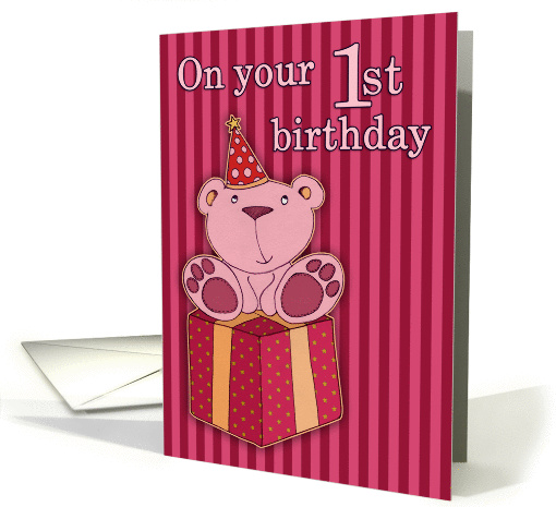 An adorable, cartoon style illustration of a cute baby pink teddy bear, sitting on a gift wrapped with red paper and gold stars with a yellow ribbon round it. Text reads: On your 1st birthday. Background is striped in dark red and pink. Perfect for a special one year old on their birthday!