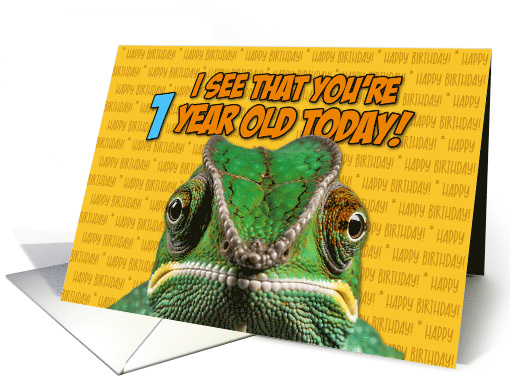 'I see That You're One Year Old Today!' A close-up shot of a googly-eyed chameleon looking straight at the birthday boy or girl on a yellow background with the repeating words 'Happy Birthday!' A fun way of wishing someone a first Happy Birthday.