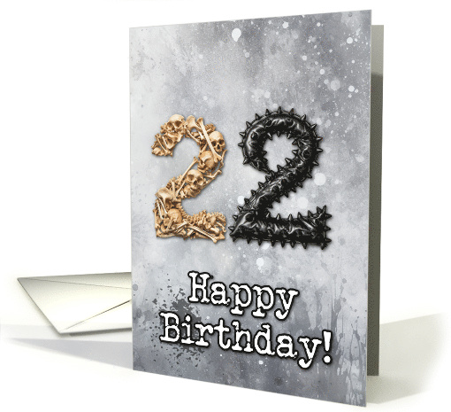 22 spelled out in bones and studded black latex in true Goth fashion on a grunge grey watercolor splatter background and the text "Happy birthday!" A perfect card to send to that special 22-year old Goth or Heavy Metal fan.