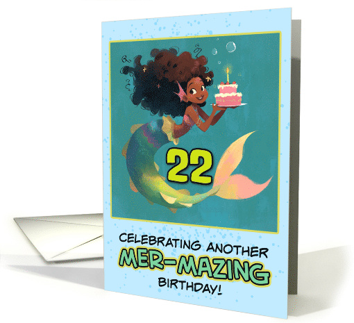 Deep in the ocean, a cute black/african american mermaid is holding a big pink birthday cake with a candle on top just for you. A mer-mazing birthday is ready to kick off! A fin-tastic card for children and young girls, beach dwellers, fantasy and mythology enthusiasts, fans of animation/movies featuring mermaids, sailors or those in maritime professions, ocean conservationists, and your wonderful 22-year old.