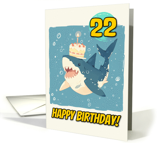 A playful and whimsical underwater scene featuring a cartoon shark with a birthday cake balanced on its head. The shark is swimming with its mouth wide open, revealing rows of sharp teeth. The cake is a small, two-layer dessert with white frosting, strawberries on top, and a single lit candle. The background is a light blue color, representing the ocean, with various sized bubbles floating around the shark. Suitable for children and teens, ocean and marine life enthusiasts, individuals with a quirky or offbeat sense of humor, fans of cute-but-dangerous aesthetic, summer birthday celebrants, and anyone looking for a non-traditional birthday card.