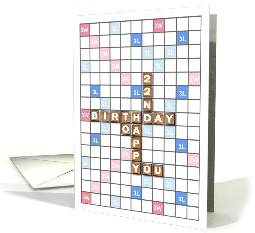 22nd birthday card for someone who loves to play word games. The letters spell out 'Happy 22nd Birthday to you.' The background picture is a word game board.