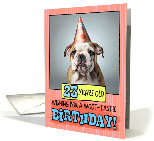 | Artist Notes: | An english bulldog puppy wearing a birthday hat on a salmon-pink background with a stripe pattern with '23 years old' in a yellow box and the text "wishing you a woof-tastic birthday!". A fun card to send to your favorite 23-year old for their birthday. |