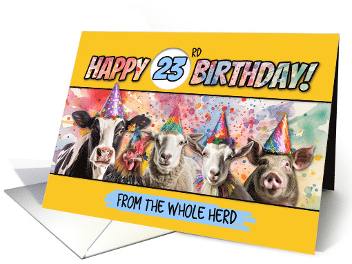 | Artist Notes: | A herd of festive farm animals - a cow, chicken, sheep, goat and pig wearing party hats - have gathered to wish you a 'Happy 23rd Birthday!' A fun card to send to your favorite 23-year old to congratulate them on their happy day. |