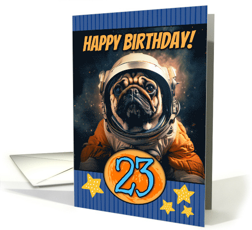 | Artist Notes: | A pug dog in a space suit is wishing you a happy 23rd birthday from outer space on a blue striped background with yellow stars. A fun card to send to that special 23-year old for their happy day. |